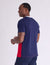 A: The front features the full navy, white, and red panels, while the back transitions into a solid navy upper for a clean, balanced look.