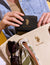 A: Interior compartments hold cash, cards, and ID; a rear slot pocket keeps frequently used items close.