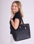 A: This tote features a generous rectangular silhouette specifically engineered to accommodate modern laptops, tablets, and letter-sized documents while maintaining its sleek profile.